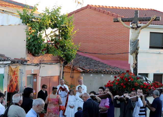 Diez altares levantados por los vecinos jalonaron un itinerario que se presentó engalanado con flores, colchas y mantones por los vecinos del barrio para honrar el paso del Cristo. En todos ellos se detuvo la procesión mientras se realizaba una oración dirigida por nuestro capellán, Florencio Gago, y por Javier Fresno -Delegado Diocesano para la Religiosidad Popular-, que nos acompañó en la procesión.