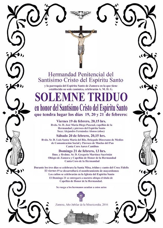 La Hermandad Penitencial del Smo. Cristo del Espíritu Santo y la parroquia del Espíritu Santo donde tiene establecida su sede canónica celebraran A.M.D.G. Solemne Triduo en honor del Smo. Cristo del Espíritu Santo, imagen titular de la hermandad y la parroquia, que tendrá lugar D.M los días 19, 20 y 21 de febrero.
